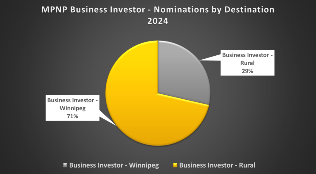 *The Business Investor Stream is comprised of the Entrepreneur Pathway (EP) and the Farm Investor Pathway (FIP). Due to the temporary-to-permanent model of the Entrepreneur Pathway (EP), the number of nominations is different than the number of approvals. EP applicants first receive an Approval in Principle and are then provided a work permit support letter. After the applicant has arrived in Manitoba on a work permit, invested in their intended business, and fulfilled the conditions in their Business Performance Agreement, they are issued a nomination. There were 7 applications Approved in Principle in 2024. Through the Farm Investor Pathway (FIP), applicants are approved and nominated. They arrive in Manitoba as a permanent resident then invest in their intended business.